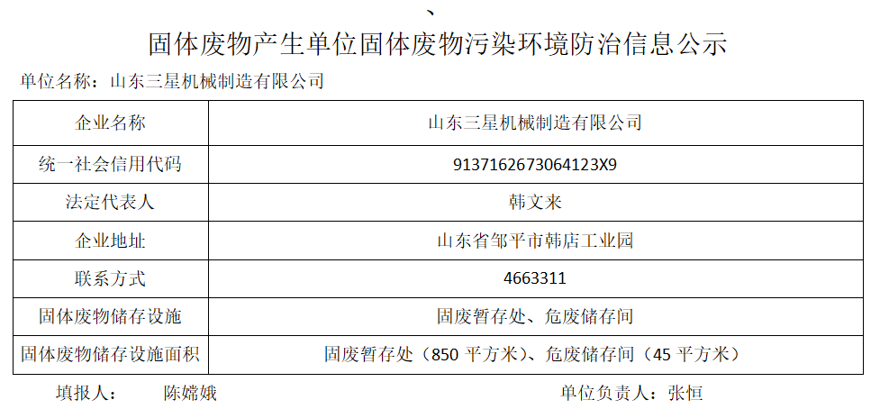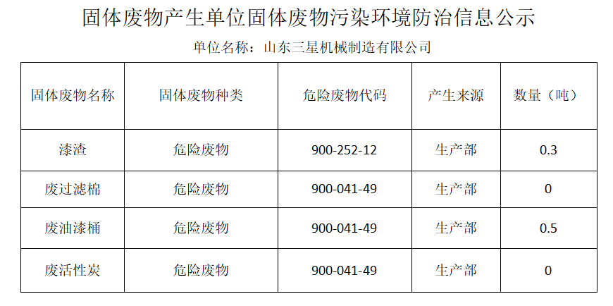 山東三星機(jī)械制造有限公司危險(xiǎn)廢物污染防治信息公示(2021)