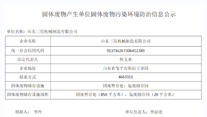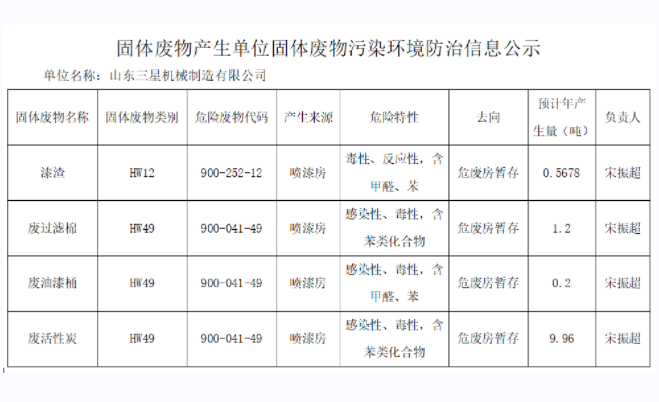 山東三星機(jī)械制造有限公司危險(xiǎn)廢物污染防治信息公示(2023)