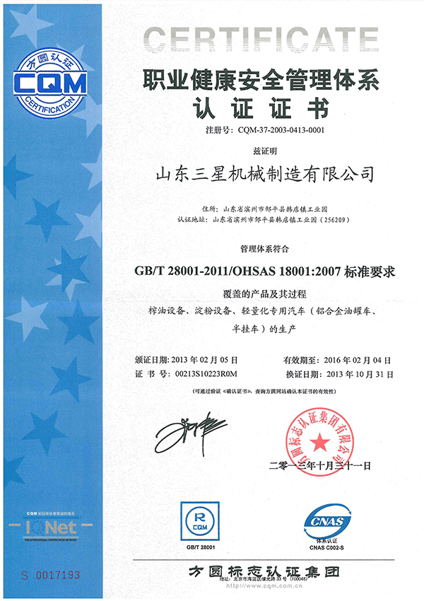 職業(yè)健康安全管理體系認(rèn)證證書